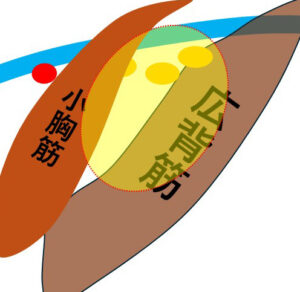 腋窩リンパ節(Ⅰ:小胸筋より概則、Ⅱ:小胸筋裏側)は小胸筋裏~広背筋にかけての範囲であり(図:黄色)